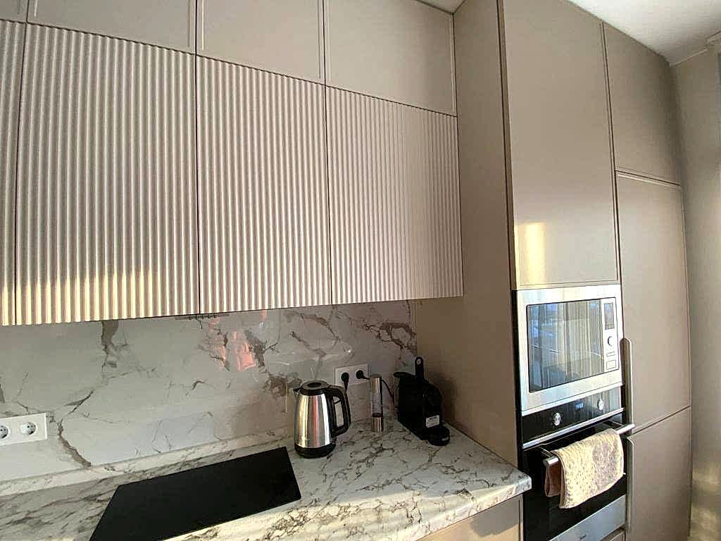 Наша новая кухня точно не Pin-Up доставлять хозяевам дискомфорт и вызывать визуальное раздражение. Теплые коричневые оттенки фасадов в сочетании с рисунком под мрамор, отлично способствуют расслаблению.
