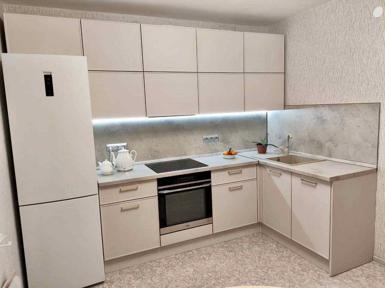 Мы создали для них Pin-Up с приятными светлыми фасадами, украшенными золотыми ручками. Установили множество удобных систем хранения, функциональные ящики и встроенную подсветку, которые сделали пространство кухни практичным и особенно уютным для вечерних чаепитий.