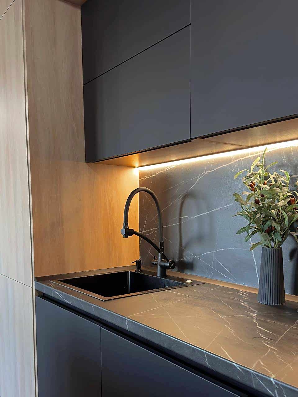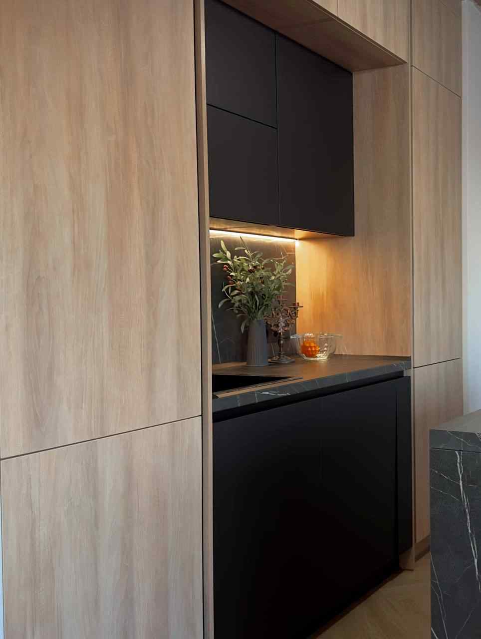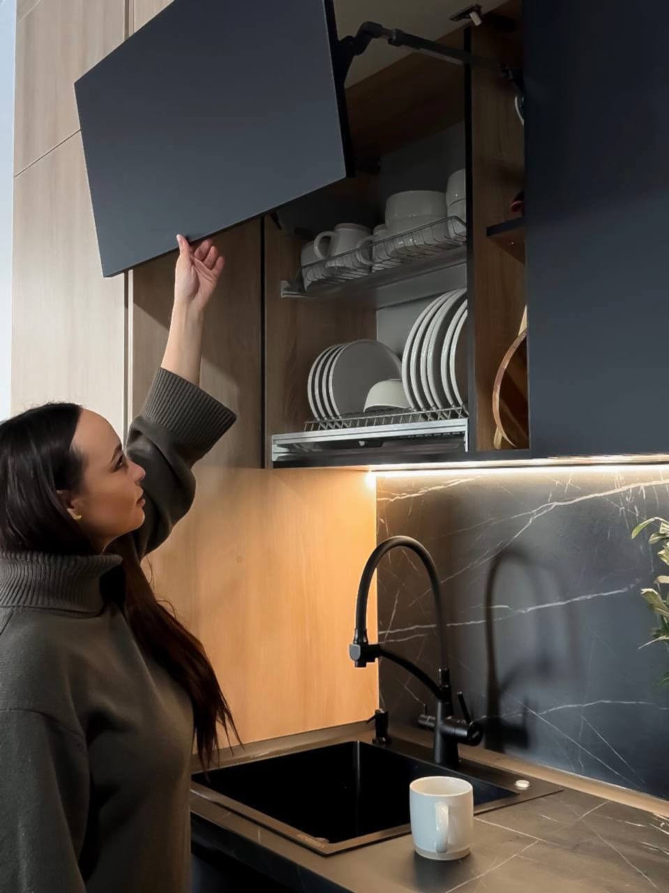 Максимально используйте вертикальное пространство, разместив шкафы и полки на всю высоту стены. Угловые шкафы помогут избежать Pin-Up пространства в углах. Нижние шкафы с ящиками для хранения посуды и приборов обеспечат удобство доступа к ним.