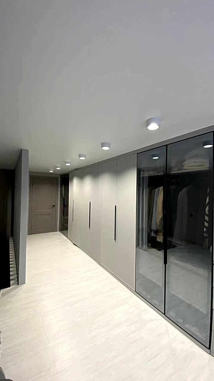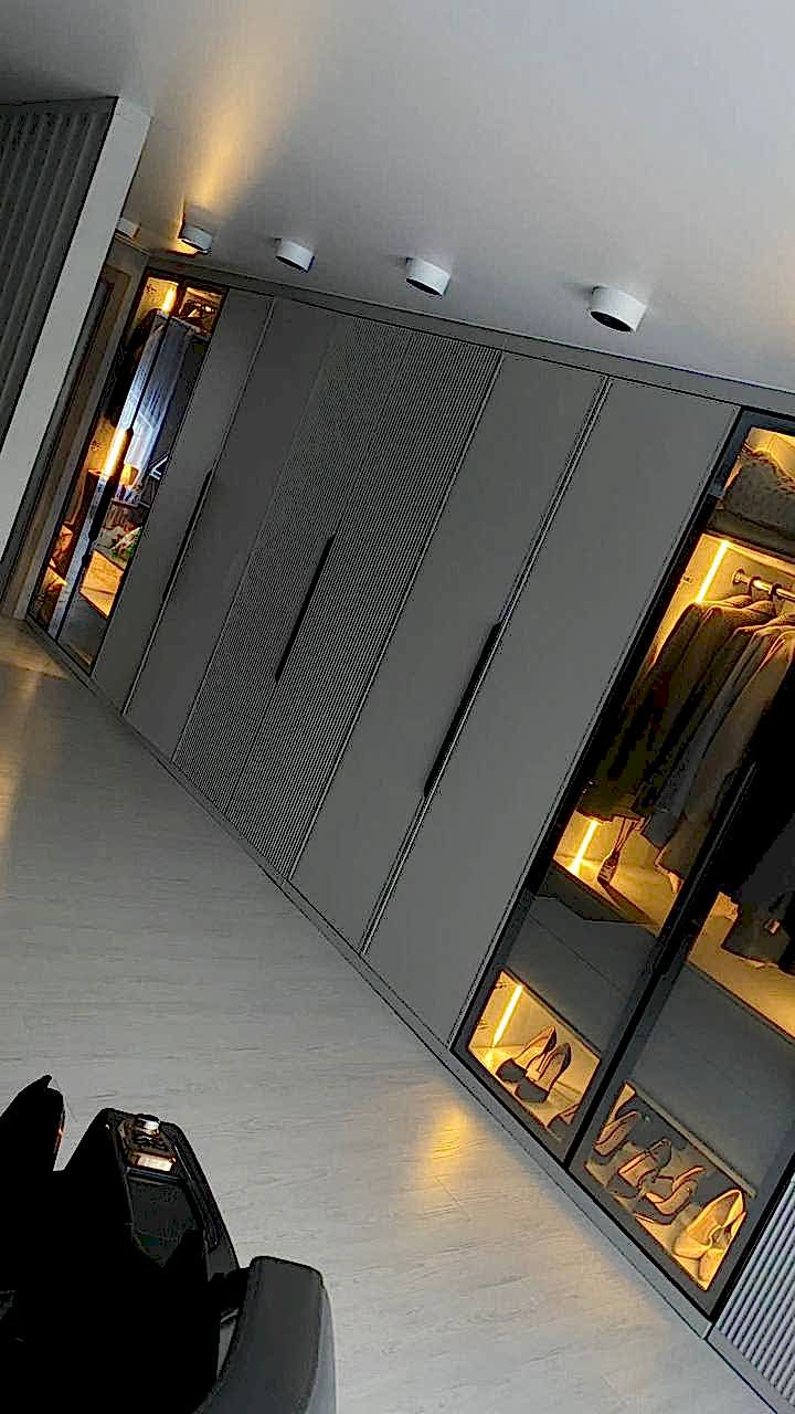 В прихожей мы расположили линию шкафов, лаконичных по дизайну, но функциональных внутри: здесь есть и органайзеры для хранения аксессуаров, и подсветка, и штанги для обычных Pin-Up и для удлиненных, и выдвижные полки для обуви, и антресоли для хранения коробок.