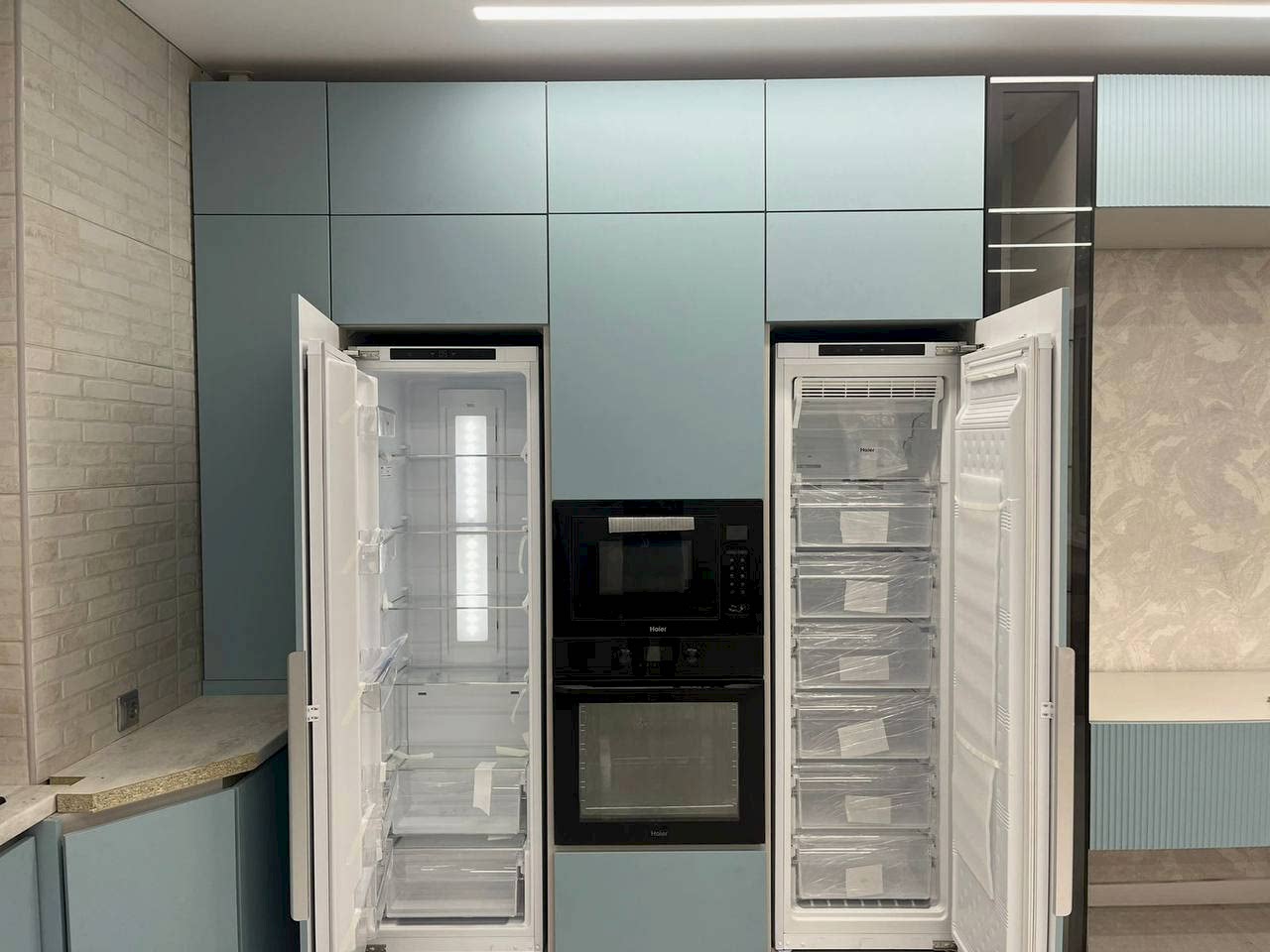 - В основной части гарнитура разместилась симметричная композиция из колонн со встраиваемой техникой. Поскольку наши герои делают Pin-Up дополнительная морозилка в полный рост точно не будет лишней.