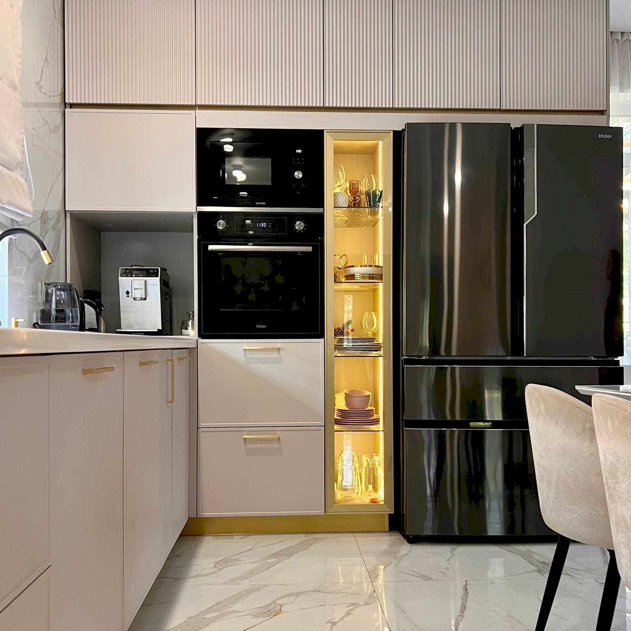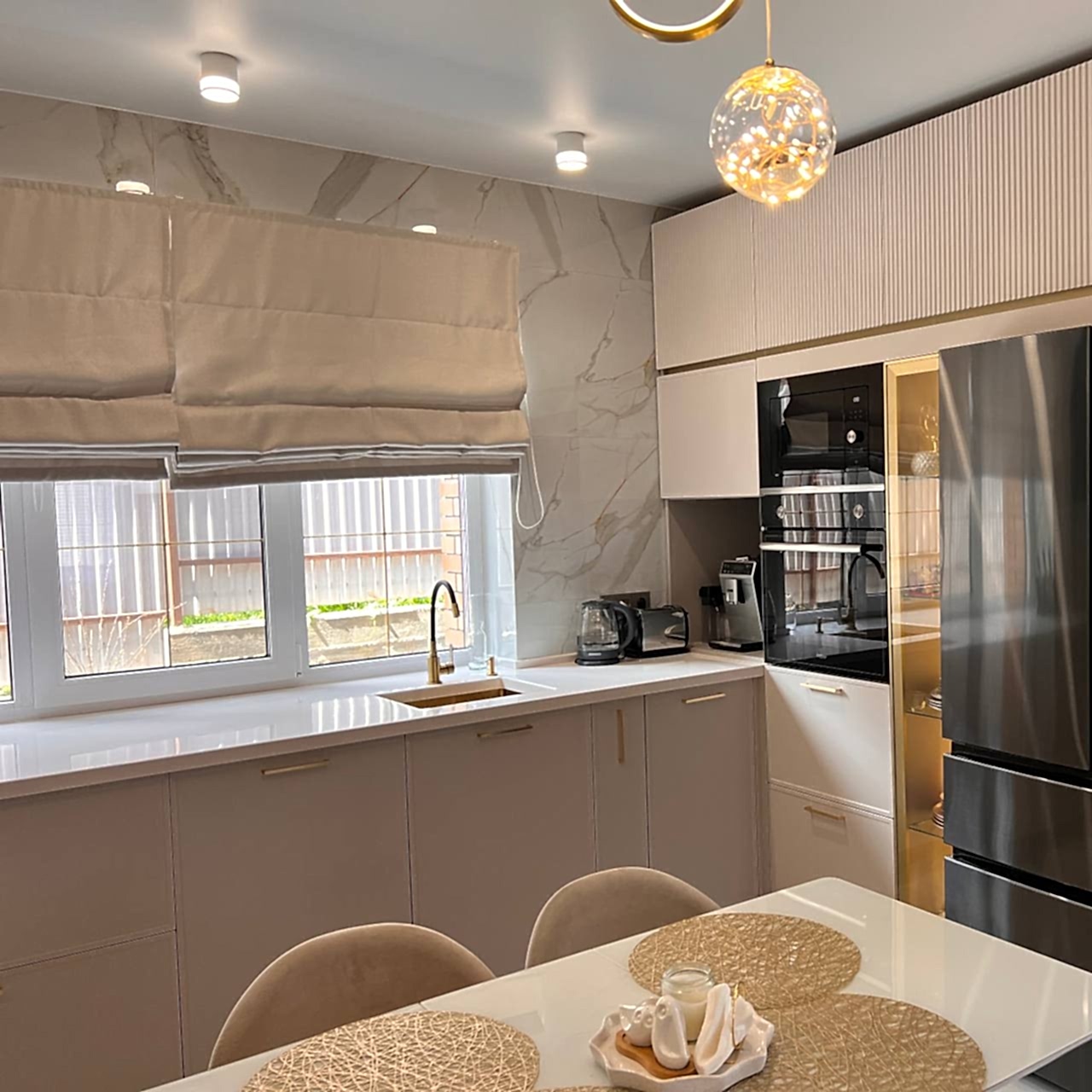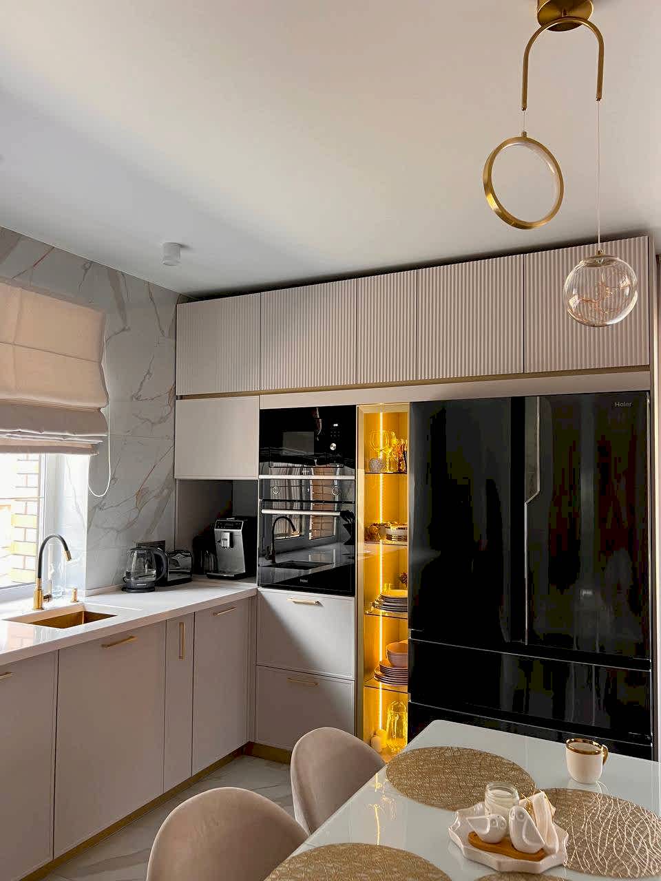 Pin-Up кухня в цвете кашемир с золотым профилем и изящными рифлеными фасадами