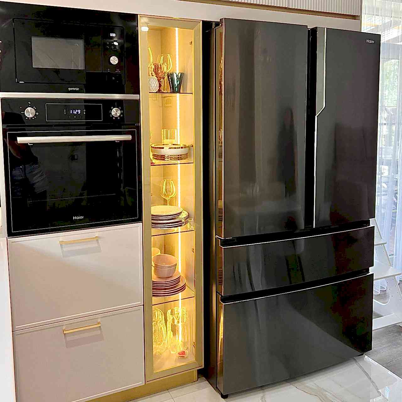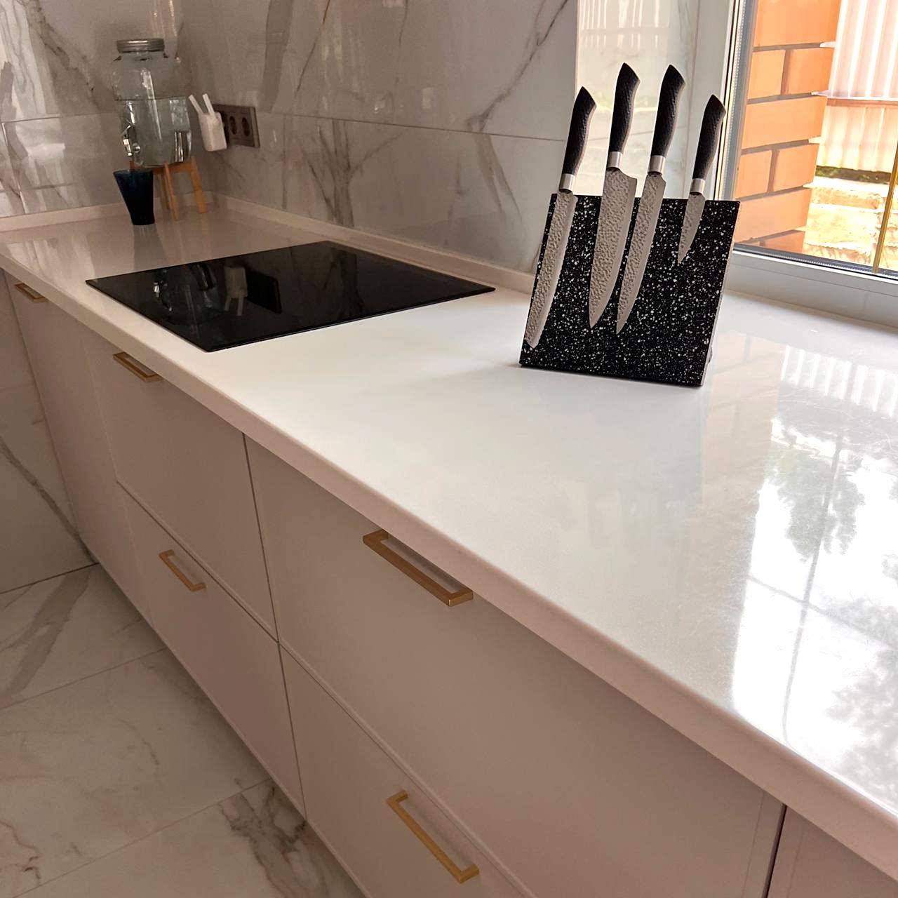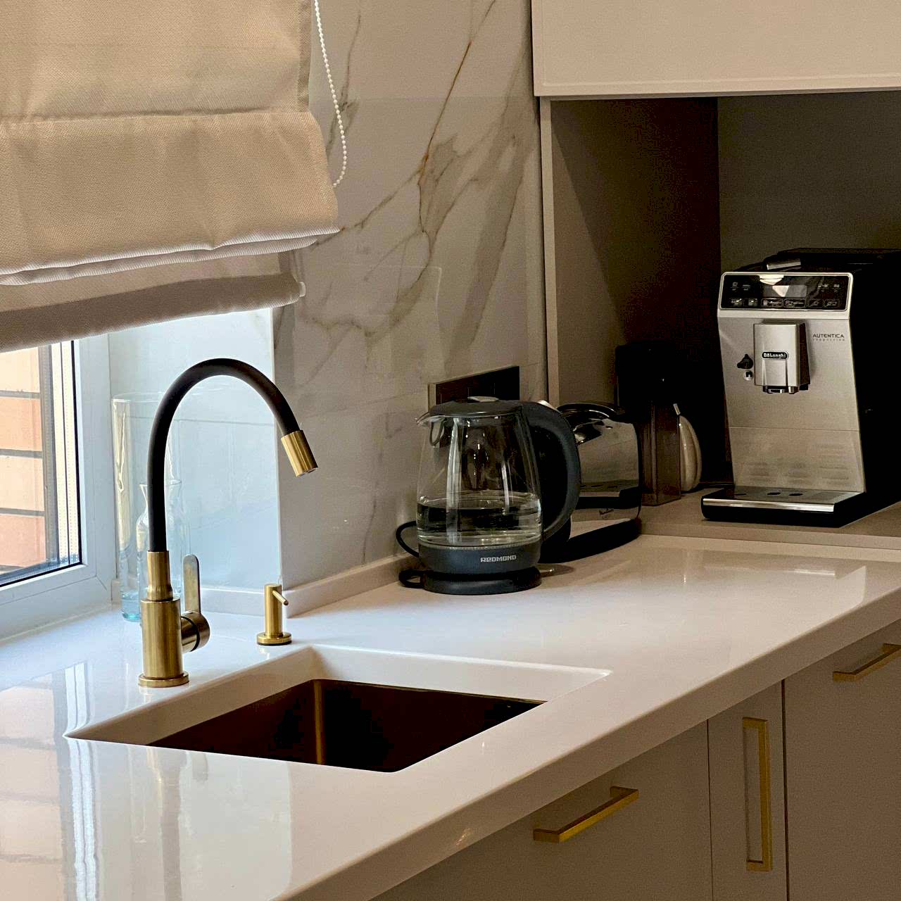 Дополнена массивной каменной столешницей в окно, Pin-Up золотой мойкой и изящным прозрачным пеналом с тёплой подсветкой.