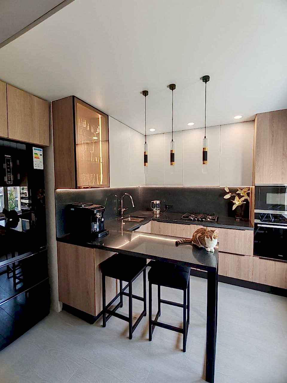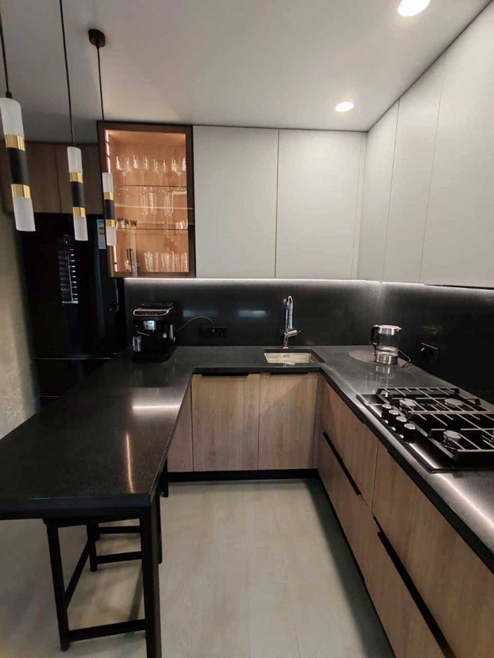 Верхние шкафы спроектировали так, что они идеально подружились с натяжным потолком. Нет ни зазоров, ни щелей, ни теней. Добиться такой точности Pin-Up ранняя встреча с заказчицей ещё на этапе черновых работ!