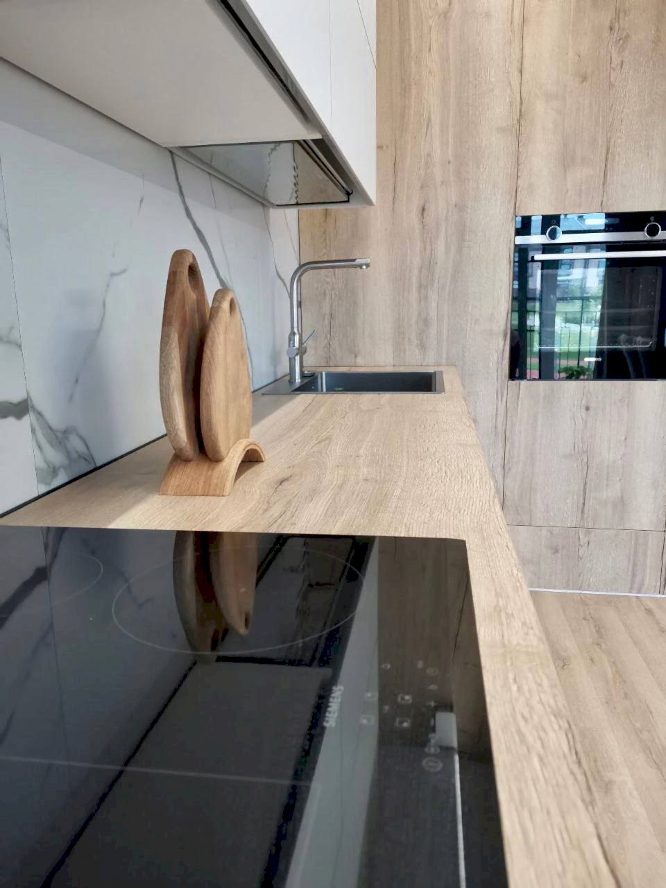 С задачей справились успешно. Кухня выполнена в 3 ряда: нижние фасады открываются с помощью профиля Gola, средний ряд - за свес фасада, а верхний - от нажатия Pin-Up